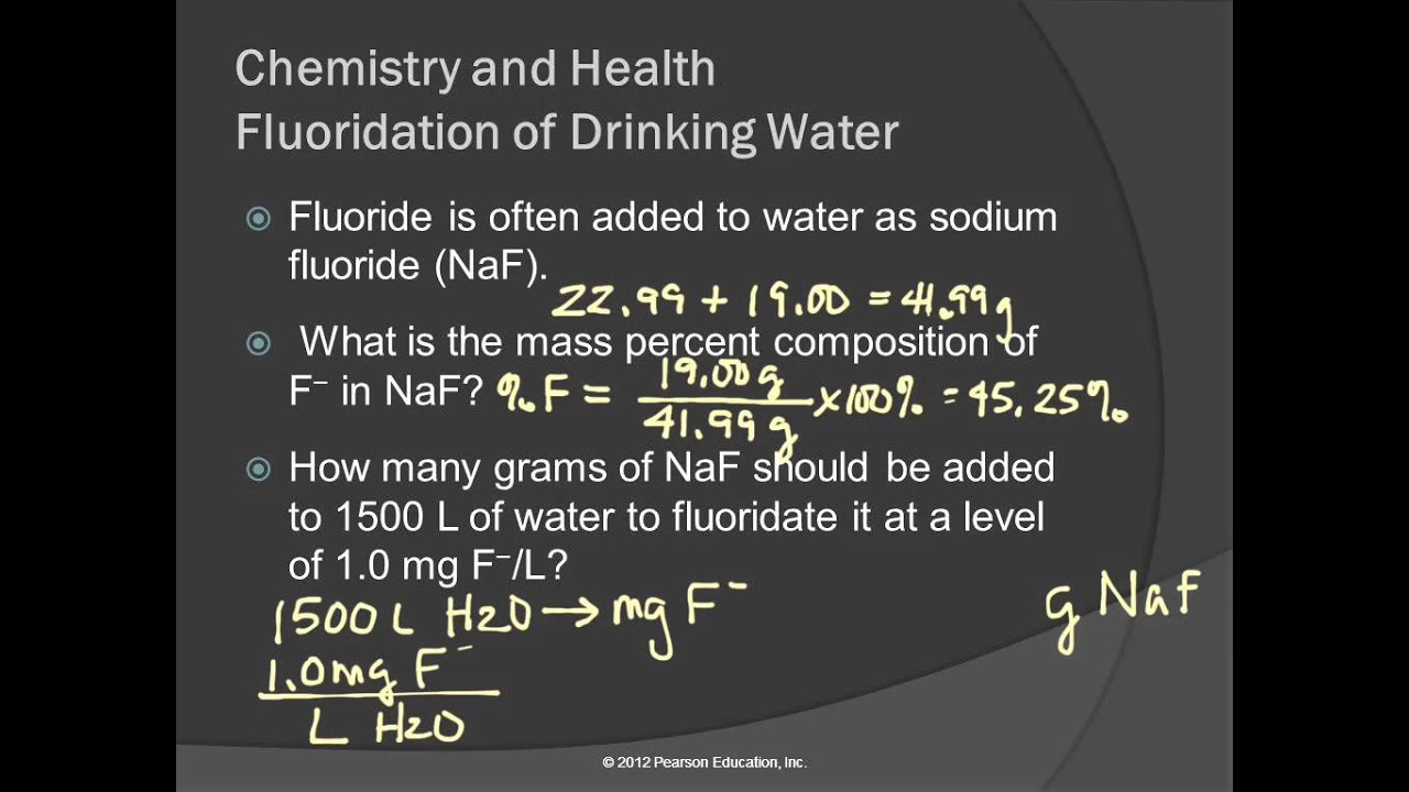 How many grams of NaF should be added to 1500 L of water to fluoridate it at a level of 10 mg F- L. Mass percent composition of F - in NaF is 4525 This problem has been solved. Molar mass of NaF is 4198817248 000000052 gmol.
